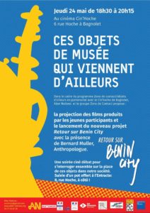 Dans le cadre de son programme Zone de Contact/objet d’ailleurs, Alter Natives vous invite à la rétrospective des productions video des jeunes participants, et le lancement de son nouveau projet RETOUR SUR BENIN CITY, le jeudi 24 mai 2018 à 18h30 au cinéma Le Cin’Hoche, 6 rue Hoche, 93170 Bagnolet (Métro Gallieni, ligne 3)