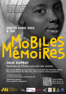 Une soirée-débat que vous pourrez suivre en ligne, pour revenir sur la présence noire dans le Bordeaux du 18e siècle. Julie Duprat proposera un focus sur la figure de l’affranchi et de l’esclavagisé au sein de la métropole. Cette thématique fait écho aux découvertes réalisées au cours de nos projet Mobiles Mémoires à Bordeaux. La soirée sera animée et préparé avec de jeunes membres d’Alter Natives.